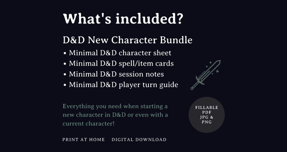Looking to start a new character for a brand new campaign with your friends? This bundle contains all of our best-selling aesthetic and minimal designed character resources: Character Sheet, Session Notes, Spell and Item Cards, and Initiative Tracker Cards.